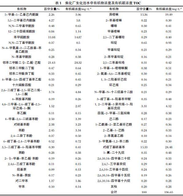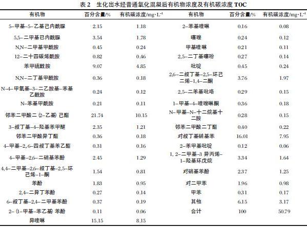 經A/O 生化階段沉淀池出水的水樣的GC/MS 圖譜及有機污染物成分分析結果(有機物濃度、有機碳濃度)如圖1、表1 所示。水樣生化外排水深度處理前共檢出有機物59 種,包括3 種含硫有機物,21 種含氮雜環有機物,多種多環芳烴和石油烴類有機物以及包括酯、醇、酸、醛、酮等其他有機物。