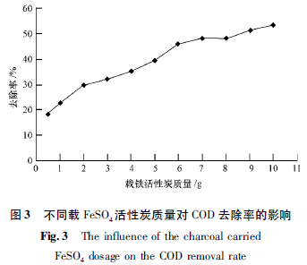 廢水中COD的去除率隨著載FeSO4活性炭量的增大而增大,當增大到某一程度時,繼續增加載FeSO4活性炭量的用量,COD去除率增加速度變緩.由圖3 可以看出,每克活性炭對COD的去除負荷為8.6×10-3g.當負載FeSO4活性炭質量從0.5 g 增加到7.0 g 時,COD去除率從17.98%增加到48.26%,繼續增加活性炭量,負載FeSO4活性炭用量從7.0 g 增加到10.0 g 時,COD去除率從48.26% 增加到53.09%,COD去除率變化不大,這可能是微波能量分散所引起的,綜合考慮,以下實驗中均選取載FeSO4活性炭用量為7.0 g 進行實驗.