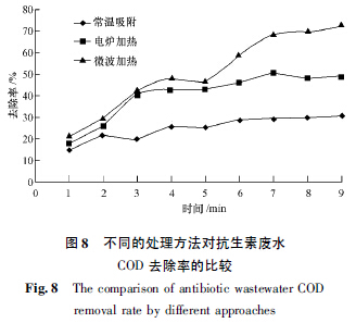 取250 mL 的錐形瓶3 個,分別加入100 mL 制藥廢水,并分別加入7.0 g 負載FeSO4的活性炭.分別進行常溫吸附、電爐上加熱和80%檔的微波爐中加熱,測定在不同的反應時間下,3種情況對制藥廢水COD的去除率,結果如圖8 所示.從圖8 可以看出,電爐加熱改性活性炭的過程比單純的常溫吸附效果好,隨著時間的延長,微波加熱對COD的去除率高于電爐加熱.