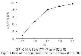 由圖3 可以看出,隨著停留時間的增加,COD 去除率呈上升趨勢,但在1.5 h 后COD 去除率變緩。廢水在微電解反應器中停留時間越長,廢水中有機物經受的氧化還原作用就越充分,但是同時會帶來處理效率降低、工程投資增大等缺點。綜合各方面因素,確定停留時間為1.5 h 比較適宜。