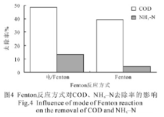 2.3 電/Fenton 與Fenton 方式對COD、NH3-N 去除率的影響