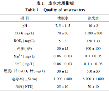 檢測表明: 前處理廢水的前三道排水中COD、SS 和pH 值很高,而染色階段染色排水及染色排水后的前三道洗水由于含有大量的助劑及未上染的染料,色度及含鹽量較高,這7 道水被劃為濁廢水; 而前處理廢水的后兩道洗水及染色廢水的最后三道洗水由于其水質較好,被劃為清廢水。經過統計分析,表1 列出了清廢水、濁廢水各項統計水質指標值。