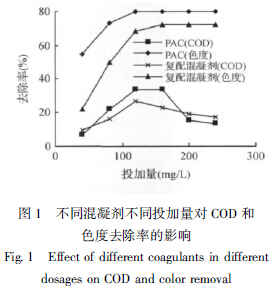 PAC 和復配混凝劑對清廢水中色度及COD 去除效果如圖1 所示。由圖1 可知,色度的去除率隨著混凝劑投加量的增加而增加,最后趨于平緩; COD的去除率隨著混凝劑投加量的增大呈先增加后減少的趨勢?梢娀炷齽┑耐都恿坎⒉皇窃酱笤胶谩.敾炷齽┩都恿窟^大時,膠粒會發生脫穩現象使凝聚效果下降,造成處理水中COD 濃度上升。2 種混凝劑相比,可知PAC 的處理效果要優于復配混凝劑,且PAC 的最佳投加量為48 mg/L。
