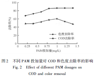 在PAC 投加量為48 mg/L 不變時,考察助凝劑PAM 投加量下對清廢水處理效果的影響,如圖2 所示。由圖2 可知,清廢水色度的去除率隨著PAM 投加量的增加而增加,但是COD 的去除率隨著PAM投加量的增加呈先增加后減少的趨勢。綜合分析表明,當PAM 投加量為1.0 mg/L 時,清廢水的色度和COD 的去除率同時達到較高的水平,這時兩者的去除率分別為86% 和62%,比單獨采用PAC 藥劑時的去除效果分別高出6%和28%。