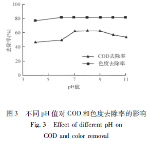 取相同量的清廢水水樣,調節水樣pH 值分別為4、6、7、8、9、10 和11,加入相同量的PAC(48 mg/L) 、PAM(1.0 mg/L) ,其他條件不變,進行混凝沉淀實驗,測量清廢水中COD 及色度的去除效果,實驗結果如圖3 所示。