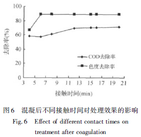 圖6 為清廢水經混凝沉淀后(PAC 投加量為48mg/L,PAM 投加量為1 mg/L) ,接觸時間對臭氧對其處理效果的影響?芍,當清廢水經過PAC +PAM 混凝后再臭氧氧化時,接觸時間大于6 min 的情況下色度去除率已趨于穩定,但是COD 的去除率還隨著接觸時間的延長而不斷增加。當通接觸時間大于12 min 時,色度和COD 去除率均不再發生變化。這時,COD 去除率為71%,色度去除率達到98%,出水濃度分別為25±10 mg/L 和1 倍?梢,該組合工藝的出水水質能夠滿足回用要求。