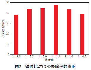 向量筒中分別加入50 g不同鐵碳比的填料,再加入200 mL pH=2.0、COD=8 713 mg/L的廢水進(jìn)行預(yù)處理實驗。經(jīng)曝氣處理后,測定水樣COD,計算COD去除率。鐵碳比對COD去除率的影響見圖2。由圖2可見,當(dāng)鐵碳比為1∶1.5時,COD去除率最高,達(dá)47.6%。因此,選擇鐵碳比為1∶1.5較適宜。