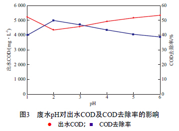 轉(zhuǎn)鼓鐵碳微電解實驗裝置的實驗條件為:鐵碳比1∶1.5,填料裝填率(填料體積與反應(yīng)器有效容積之比)1∶10,HRT=3 h,轉(zhuǎn)鼓轉(zhuǎn)速2 r/min,室溫(20 ℃左右)。用HCl或NaOH溶液將廢水pH分別調(diào)節(jié)至1.0,2.0,3.0,4.0,5.0,6.0,分組進(jìn)行實驗。每組實驗在開啟進(jìn)水泵進(jìn)水處理3.0 h后取樣,測定水樣COD,計算COD去除率。廢水pH對出水COD及COD去除率的影響見圖3。由圖3可見:當(dāng)廢水pH=2.0時,COD的降幅最大,去除率達(dá)49.8%;此后,隨pH的增大,COD去除率下降。因此,選擇廢水pH=2.0較適宜。