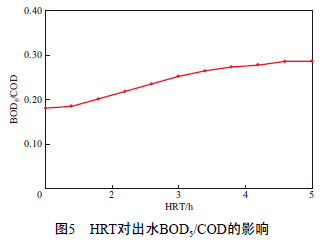 HRT對出水BOD5/COD的影響見圖5。由圖5可見,廢水經(jīng)轉(zhuǎn)鼓鐵碳微電解處理后,BOD5/COD隨HRT的延長而提高,處理前為0.181,3 h后提高到0.265,5 h后達(dá)到0.287。綜合考慮,選擇HRT=3 h較適宜。
