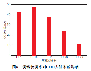 在轉(zhuǎn)鼓鐵碳微電解反應(yīng)器內(nèi)加入鐵碳比為1∶1.5的填料,在控制轉(zhuǎn)鼓轉(zhuǎn)速2 r/min、HRT=3h、廢水pH=2.0的條件下,填料裝填率對COD去除率的影響見圖6。由圖6可見:填料裝填率為1∶10時處理效果最好,COD去除率達(dá)到46.8%。這是由于:在轉(zhuǎn)鼓中填料裝填過多時,轉(zhuǎn)鼓轉(zhuǎn)動時填料不能實現(xiàn)充分?jǐn)嚢瑁瑫r傳質(zhì)也會受到一定影響;而填料裝填率低時微電解反應(yīng)物不足,反應(yīng)速率緩慢。因此,選擇填料裝填率為1∶10較適宜。