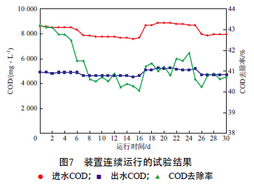 在上述實驗確定的最優(yōu)工藝條件下,進(jìn)行30d的裝置連續(xù)運行試驗,以檢驗系統(tǒng)的運行穩(wěn)定性。裝置連續(xù)運行的試驗結(jié)果見圖7。由圖7可見,雖然進(jìn)水水質(zhì)有所變化,但轉(zhuǎn)鼓鐵碳微電解設(shè)備對廢水COD的去除率在30 d內(nèi)基本穩(wěn)定,保持在40.1%~43.2%之間,并呈緩慢下降趨勢。