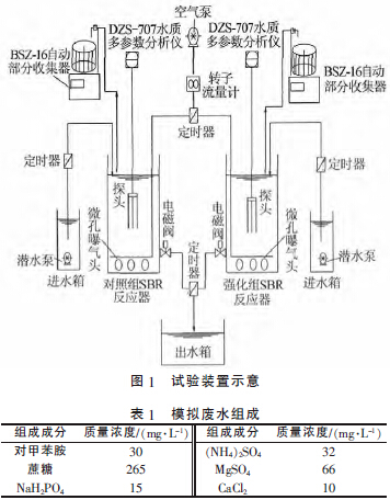試驗裝置如圖1 所示。序批式反應(yīng)器直徑為20 cm,高為30 cm,有效體積8 L,接種活性污泥2 L,每周期進(jìn)水5 L(不裝填料)。投加對甲苯胺降解菌的反應(yīng)器為強(qiáng)化反應(yīng)器,不投加對甲苯胺降解菌的反應(yīng)器為對照反應(yīng)器。兩個反應(yīng)器均在室溫下運(yùn)行,每周期8 h,進(jìn)水1 min,反應(yīng)時間6 h,出水0.5 h,靜置1.5 h。反應(yīng)時控制溶解氧為2~4 mg/L。
