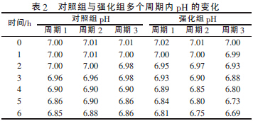 由表2 可見,強(qiáng)化組的pH 下降速率和下降幅度都顯著大于對照組。這是由于鄰位開環(huán)途徑廣泛存在于芳烴類化合物(苯胺、苯甲酸、苯酚等)的微生物降解中〔5〕,該代謝途徑可產(chǎn)生有機(jī)酸引起pH 的下降。而強(qiáng)化組中投加的寡養(yǎng)單胞菌AT1-3 可有效提高對甲苯胺的降解速率。因此強(qiáng)化組的pH 下降速率和下降幅度顯著大于對照組。