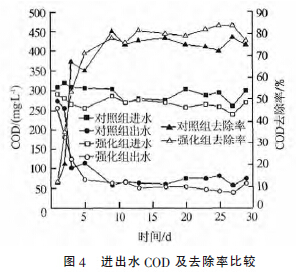由圖4 可見,對照組中的微生物開始逐漸對COD 進(jìn)行降解,出水COD 維持在66 mg/L 左右,去除率整體維持在72%~81%。強(qiáng)化組由于有專效菌種的投加,其比對照組啟動快,前5 d 的COD 去除率呈線性增長,出水COD 從255 mg/L 下降到72 mg/L,去除率可達(dá)到71%,隨后反應(yīng)器穩(wěn)定運(yùn)行,出水COD維持在60 mg/L 左右,其出水COD 略低于對照組。