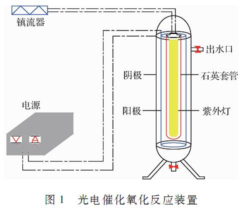 實(shí)驗(yàn)裝置如圖1所示,利用蠕動(dòng)泵將反滲透濃水注入到光電催化氧化反應(yīng)器中,TiO2/Ti陽(yáng)極和陰極分別與DH1718E-4型雙路跟蹤穩(wěn)壓穩(wěn)流電源的相關(guān)輸出端連接,通過(guò)調(diào)節(jié)外加電源來(lái)控制反應(yīng)電流密度,光源采用主波長(zhǎng)為254nm的紫外燈,陰極和陽(yáng)極的有效面積為450cm2,極板間距為I[9,光電催化氧化反應(yīng)器有效容積為3cm。在恒流條件下,對(duì)不同反應(yīng)時(shí)間的出水進(jìn)行分析,考察COD、氨氮及色度等污染物指標(biāo)的變化情況。