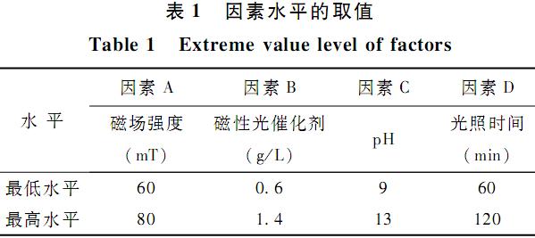本實(shí)驗(yàn)以磁場(chǎng)強(qiáng)度(A)、磁性光催化劑投加量(B)、PH值(C)和光照時(shí)間(D)為4個(gè)影響因素,模擬廢水的脫色率為評(píng)價(jià)指標(biāo),根據(jù)Box-Behnken的實(shí)驗(yàn)設(shè)計(jì)原理設(shè)計(jì)正交實(shí)驗(yàn),各影響因素的最高水平與最低水平值見表1。具體參見http://www.bnynw.com更多相關(guān)技術(shù)文檔。