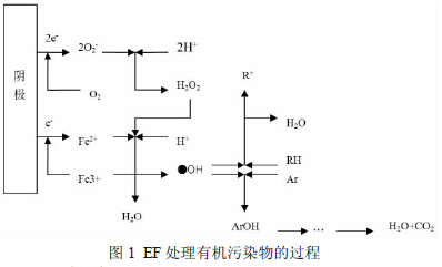 Electro- Fenton 有其自身的優勢[1]:電化學產生H2O2,可避免其在運輸、儲存和操作的危險;控制降解速率實現機理研究的可能性;由于陰極持續的Fe2+ 再生提高了有機污染物的降解速率,這也減小了污泥;在最佳條件下,可實現低花費小的全部礦化的可行性。