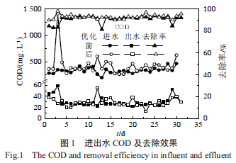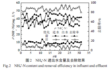 從圖1 可以看出,優化前后進水的COD 差異不明顯(除12 月3 日外),出水中COD 在優化前后差異也不顯著,由此表明,CAST工藝優化對COD 的去除影響不明顯。優化前后的COD 平均去除率分別為90.81%和92.72%,在大部分的時間沒有明顯的差異,這表明優化前后CAST工藝對有機物的去除均達到較高的水平。從圖1 也可以看出,CAST工藝優化后,進水的COD 波動較大,變幅為267~1 408mg/L,平均為439.3 mg/L,但出水COD 均維持在較低的水平(13.2~54.6 mg/L,平均29.55 mg/L),表明優化后的CAST優化更加穩定。