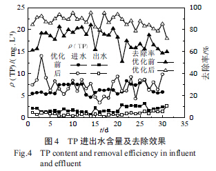 從圖4 可以看出,優化前,進水TP 的質量濃度平均為6.48 mg/L(4.62~8.50 mg/L),出水為1.86mg/L(0.73~3.20 mg/L),平均去除率為71.19%(變化在51.02%~84.20%);優化后,進水TP 的質量濃度平均為7.33 mg/L(3.38~14 mg/L),出水0.91 mg/L(0.23~2.69 mg/L),平均去除率87.22%(71.95%~95.34%)。對照GB 18918-2002 可以發現,優化前大部分(65%)未達一級B 標準,而優化后,除了31日外,全部達一級B 標準。優化后,TP 去除率也提高了16.03個百分點。因此,CAST工藝優化之后有效提高TP 的去除效果。