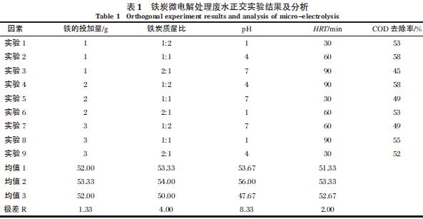 微電解處理廢水實驗的影響因素較多,不同成分的廢水,所需要的實驗條件不盡相同[8]。本次實驗主要對微電解的反應時間、反應pH、鐵炭質量比及鐵的投加量的影響進行分析,通過正交實驗確定其分別對廢水處理效果的影響的大小順序,確定微電解單元的實驗參數,正交實驗結果分析見表1。