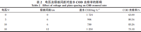 由表2 可知當電壓為10 V、極板間距為6 cm時,廢水COD 去除率達到83.3%,相對于單獨微電解提高了20.3%,這是因為外加電壓的加入增強了廢水中的氧化還原反應的同時在陽極附近產生少量的氣體,產生一定的攪拌作用,增加鐵碳的接觸面積。隨著電壓增大,極板間距的減小,COD 的去除效果增大,這是因為電流的加大,加快了有機物向電極的移動速度,增加了鐵炭與有機物的接觸面積,從而提高廢水的處理效果。