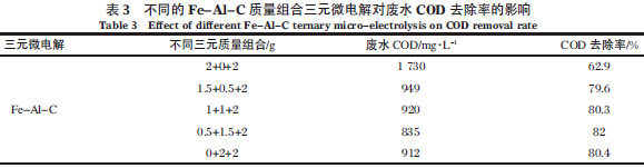 對于不同成分的廢水,微電解的電極反應會有很大差別,廢水的處理效果與微電解反應的陰極、陽極的反應息息相關。因此,陰、陽極材料的正確選擇及其在廢水中溶解的加速,是提高微電解處理效果的關鍵。通過向Fe-C 微電解體系中投加Al 構建三元微電解體系來提高微電解處理效果,不同的Fe-Al-C 質量組合三元微電解對廢水處理效果的影響見表3。