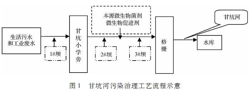 結合甘坑河的實際情況將治理工藝設計如下(見圖1):從源頭到格柵一段,通過直接投加本源微生物菌劑和微生物促進劑進行治理。為了控制河流水位和流速,延長水力停留時間以便菌劑充分反應,分別在甘坑小學前、甘坑小學后、格柵前50m處各壘一個人工壩,壩高0.9m,壩寬1.2m,編號見圖1。具體參見http://www.bnynw.com更多相關技術文檔。