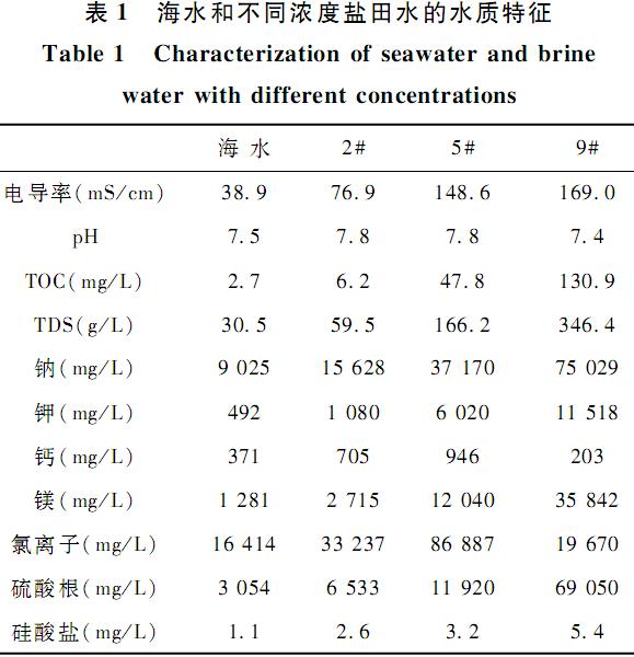 海水和不同濃度的鹽田水的水質特征如表1所示。