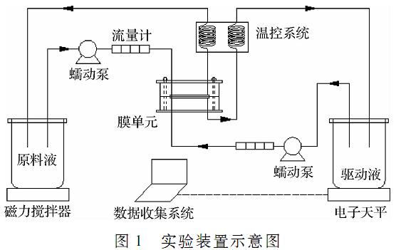 實驗裝置示意圖如圖1所示。采用錯流膜單元,中間放置膜片,兩側為矩形流道,原料液和驅動液在蠕動泵作用下循環,有效膜面積33.8cm2。實驗采用的錯流速率為18cm/s。采用恒溫水浴槽控制溫度為(25±1)°C,采用數據收集系統和電子天平監測驅動液重量變化。具體參見http://www.bnynw.com更多相關技術文檔。