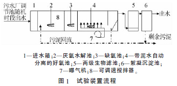 試驗在該工業區污水處理廠現場進行,該污水廠采用“水解酸化+MSBR+絮凝沉淀”工藝處理工業區廢水。抗生素類工業廢水占進水總量的80%以上。由于該廢水COD較高,污水中氮、磷相對較高,水質、水量變化較大,B/C 低,廢水難生物降解,要求生物處理工藝不但要提高可生化性,而且要有較高的硝化能力和除磷能力。