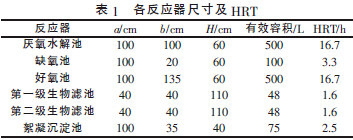 HRT 是A2O 工藝運行的關鍵因素。在厭氧池中過長的HRT 可能導致聚磷菌的無效放磷,從而影響后續除磷效果;過短的HRT 使磷得不到充分有效的釋放,同時發揮不了對難生物降解物質的生物降解作用。為便于研究“A2O 法+生物濾池+絮凝沉淀”組合工藝對工業廢水的處理效果,試驗中各單元池體的HRT 參考該污水處理廠相應單元的HRT,總停留時間與污水廠基本一致,各反應器具體尺寸及有效容積如表1所示。各個反應器之間水力連通,其中帶泥水自動分離的好氧池回流至厭氧水解池的污泥量為100%(進水流量Q=30.0 L/h),進水、污泥回流及加藥均通過統一型號蠕動泵實現;采用鈦鋼加熱棒及智控恒溫系統調節試驗水溫。