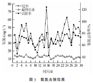 由圖6 可見,試驗裝置最終出水平均氨氮為12.62 mg/L,平均氨氮去除率為66.5%;污水廠出水平均氨氮為10.32 mg/L,平均氨氮去除率為72.2%。試驗裝置對氨氮的去除效果略差于該污水廠,但仍達到一級排放標準。
