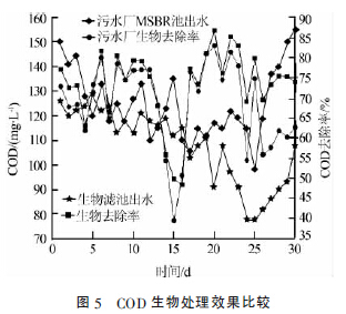 試驗裝置與污水廠的COD生物去除效果對比如圖5所示。