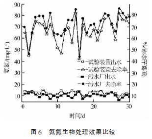 試驗裝置與污水廠的氨氮生物去除效果對比如圖6所示。