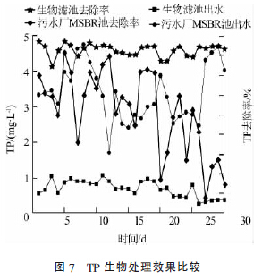 由圖7 可見,試驗裝置生物濾池出水平均TP為0.70 mg/L,TP 平均生物去除率為92.8%;污水廠MSBR 池出水平均TP 為3.39 mg/L,TP 平均生物去除率為61.8%。試驗對TP 的去除效果大大優于該污水廠。