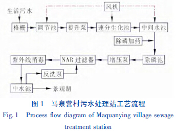 馬泉營村污水處理站位于北京市朝陽區崔各鄉馬泉營村濕地公園旁,主要處理馬泉營村(約7 000人)和何各莊村(約4 000 人)的生活污水(洗浴水、沖廁水、廚房水等),設計處理水量為1 000 m3 /d,占地面積約400 m2,總投資為300 萬元。污水處理站二級處理采用速分生化+ NAR 交換集成技術,出水水質執行北京市地方標準《水污染物排放標準》(DB 11 /307—2005)一級B 標準。通過對京郊新農村污水處理技術進行調研,從建設投資、運行費用、管理水平、處理效果等方面進行對比,提出如圖1 所示的處理工藝流程。