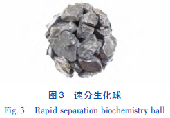 速分生化處理技術的核心是“速分生化球”(見圖3),作為生物載體,填充在專門設計的速分生化池內,附著在其上的生物膜是生化處理系統的主體。速分生化球采用特殊礦石,并加入誘導材料的粘合劑粘壓而成,可正常使用30 年而無需更換,比傳統生物填料節約了大量的更換、維護費用。