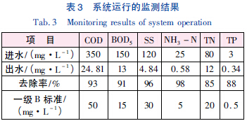 系統試運行的監測結果(平均值)見表3。整套廢水處理系統運行良好,出水水質達到了北京市地方標準《水污染物排放標準》(DB 11 /307—2005)一級B 標準。