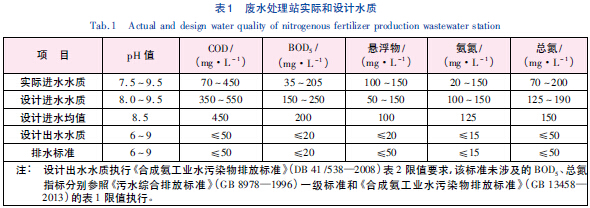 河南某大中型煤化工企業的生產能力已分別達到24×104 t/a 合成氨、40×104 t/a 尿素、6×104 t/a精甲醇、6×104 t/a 甲胺和6×104 t/a 二甲基甲酰胺(DMF)。實際綜合排水和設計處理水質見表1。廢水碳氮比在1~2 的范圍內波動,具有明顯的低碳氮比水質特征; 綜合排水具有較好的可生化性(B/C值約為0.45),可為廢水生物脫氮處理提供第一類碳源。