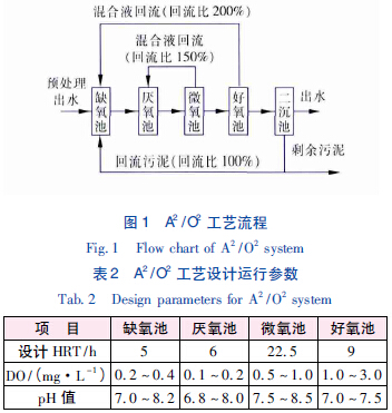 我國氮肥生產企業長期以來排放廢水中有機物與總氮的比值僅為1~2,不能滿足常規脫氮工藝對處理水質碳氮比的需求,因此常需要額外投加甲醇等有機物對碳源進行補充,處理成本過高; 而目前,國內外對適用于低碳氮比廢水的如短程硝化反硝化、厭氧氨氧化等新型脫氮工藝多處于實驗室研究階段,工程應用實例很少。因此,作者從實際污水處理廠倒置A2/O 工藝系統中好氧區部分區段在控制低濃度DO 運行時其脫氮效果明顯提高的現象中受到啟示,并結合好氧區低溶解氧區域分布與總氮去除率關系初步分析結果,提出缺氧/厭氧/微氧/好氧工藝(A2/O2 工藝),在中試取得較好生物脫氮效果的基礎上,應用于河南某氮肥化工企業廢水處理站(15 000 m3/d)。運行結果表明,在不額外投加碳源的條件下,出水COD、氨氮、總氮等水質指標均達到國家和河南省《合成氨工業水污染物排放標準》。