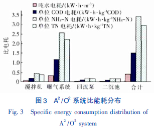 借鑒城市污水處理廠比能耗分析的方法,對廢水處理站內A2/O2 系統的用電設備進行了實際電耗檢測,取三次檢測耗電量均值統計其比能耗,即噸水處理電耗及處理1kgCOD、氨氮、總氮電耗等,結果如圖3 所示。