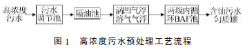 高濃度污水預處理裝置設計處理水量為50 m3/h。設計進水水質COD≤4 000mg/L,石油類≤100mg/L,SS≤1 000mg/L;預處理系統出水水質COD≤1 000mg/L,石油類≤15mg/L,SS≤40mg/L。