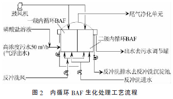 由于高濃度污水的污染物濃度高、水質波動大,常規生物處理方式無法承受。采用強化生化處理技術——內循環 BAF 技術進行高濃度污水的生化處理,通過利用內循環BAF 技術的大流量內循環流的水力學特征,首先對進入裝置的高濃度原水進行大比例的稀釋,從而使整個反應器的生化環境得以穩定,再利用內循環BAF 技術的傳質速度快、微生物種類多、活性高的特性,將高濃度污水中的污染物快速降解,從而達到預處理的目的。高濃度污水內循環BAF 生化處理單元流程如圖2 所示。