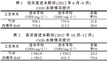 高濃度污水預處理系統氣浮單元和內循環BAF 單元的COD去除情況分別如圖3、圖4 所示。