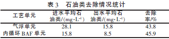 由表3 可見,氣浮、內循環BAF 工藝單元對石油類具有良好的去除效果。運行期間,兩級氣浮單元對石油類的去除率為43.8%,內循環BAF 單元對石油類的去除率為45.9% ,總COD去除率達到了69.6%。經過預處理后,水中石油類質量濃度平均值由進水的28.1mg/L 降低至8.5mg/L,滿足了預處理的設計要求。