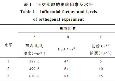 正交實驗選擇溶液中初始H2O2濃度、H2O2:Fe2+的摩爾比、Cu2+濃度作為實驗的影響因素,判斷=個因素對體系的影響作用大小排序。每個影響因素選擇=個有代表性的水平(見表1)。