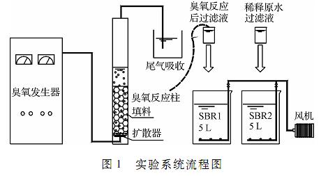 臭氧接觸反應器為直徑65mm,高500 mm的PVC柱(V-1000mL),反應器底部設臭氧擴散器,反應器內部為增加臭氧與液體的接觸時間,填充一定量塑料拉西環。先在反應器中加入原水500 mL,用NaOH調節PH,然后啟動臭氧發生器,運行穩定后通入反應器中,同時開始計時,臭氧投加量按每分鐘臭氧發生器的臭氧產量與原水體積之比計為投加濃度(mg/L),接觸時間根據實驗要求確定,反應完成后,將反應液過濾,取上清液測定COD和色度。