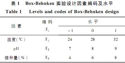 在單因素實(shí)驗(yàn)結(jié)果基礎(chǔ)上,以溫度(X1)、PH(X2)與接種量(X3)為考察因素,以耗糖量作為響應(yīng)值(Y),進(jìn)行響應(yīng)面優(yōu)化實(shí)驗(yàn),確定霉菌凈化糖廠濾泥的最佳條件。因素及水平見表1。
