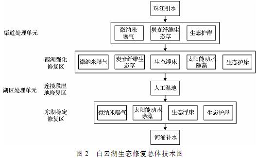 常規修復是指白云湖的日常生態修復,包括兩大處理單元,即入湖前的引水渠道處理單元和入湖后的湖區處理單元。其中渠道處理單元采取沉淀池沉淀、炭素纖維生態草、微納米氣泡發生裝置、生態護岸等措施;湖區處理單元采用炭素纖維生態草、微納米氣泡發生裝置、太陽能動水除藻、生態浮床、生態護岸等措施。白云湖生態修復總體技術情況見圖2。