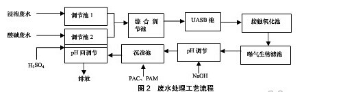 由于廢水中含有大量的三價鐵離子, 導致生化處理后水質 顏色發黃, 而且由于鐵離子的絮凝作用, 使出水帶有細小的懸浮物,難以沉降。在傳統處理工藝(UASB 池+接觸氧化池+曝氣生物濾池)處理后,COD 的含量超出出水標準:COD≤100 mg/L,為此采取處理工藝:出水先加NaOH 調節 pH,然后進入沉淀池,并加入聚合氯化鋁(PAC)、聚丙烯酰胺(PAM),使三價鐵離子形成沉淀,從而有效的去除了水中的懸浮物,COD 的含量也降到標準以下,再進行加 H2SO4 調節 pH,使出 水達標排放。處理工藝見下圖: